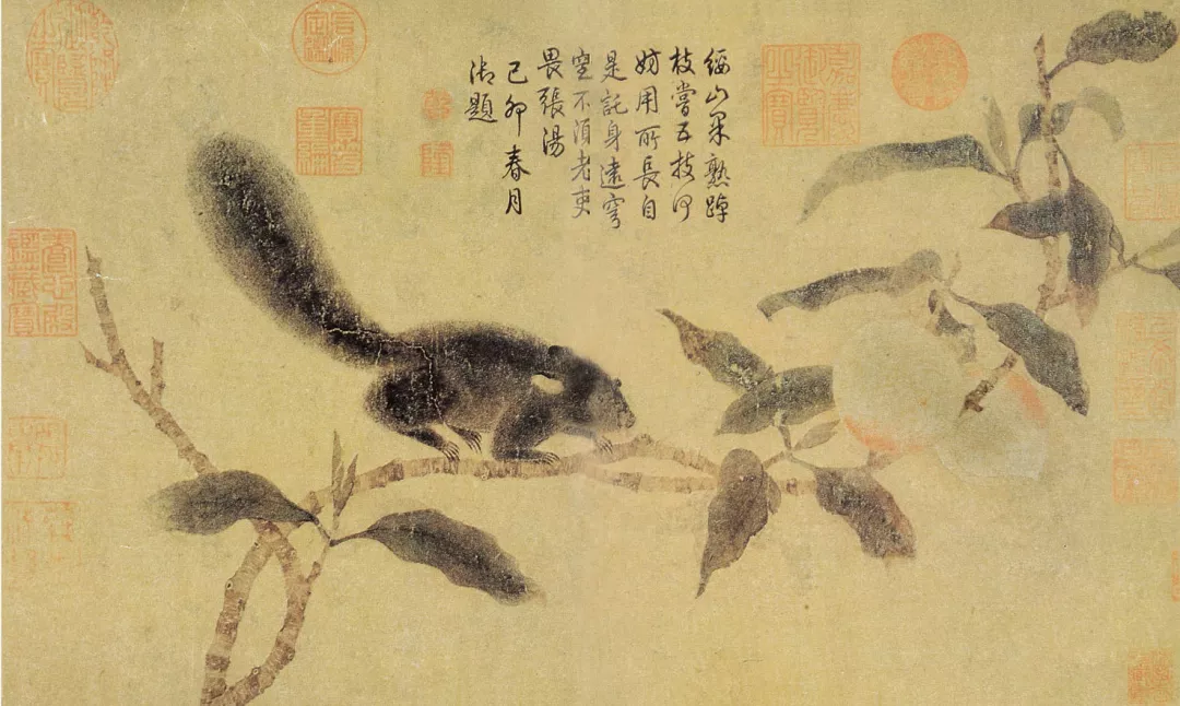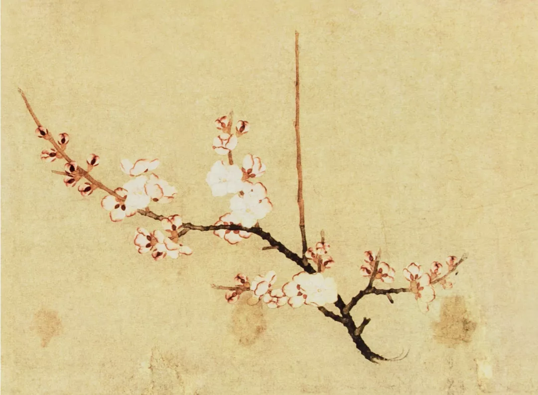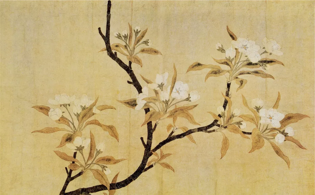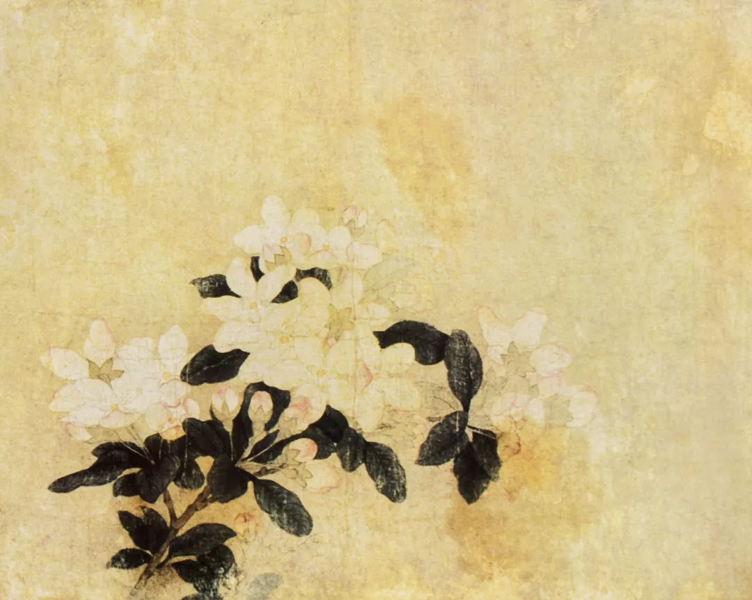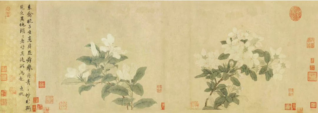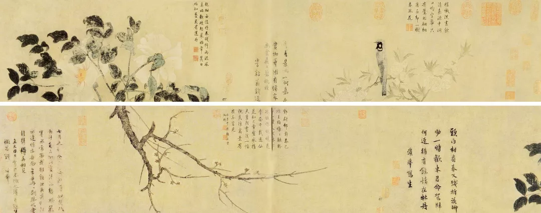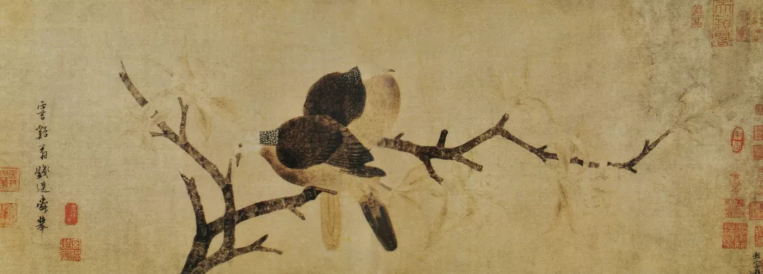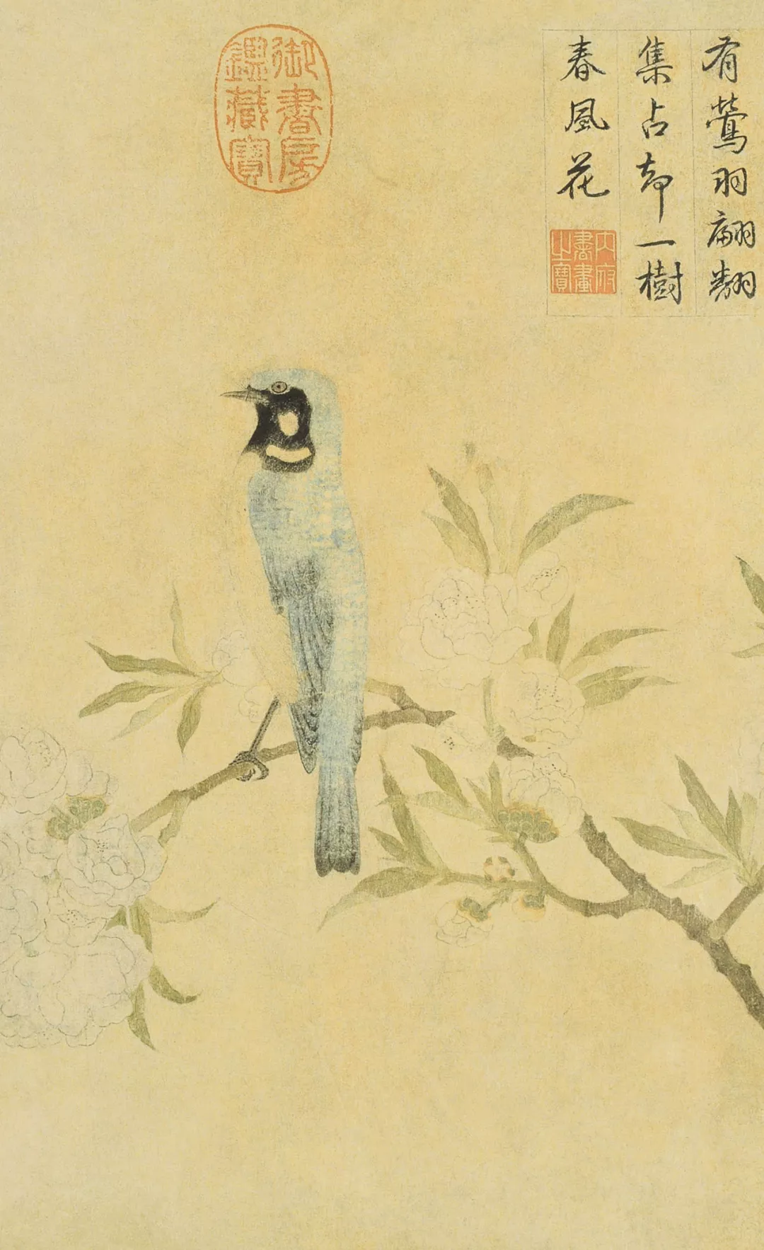 钱选在《花鸟图三段卷》中,将宋代院体画的工致推向极致,却以“不似之似”解构了形似崇拜。他笔下的牡丹花瓣,边缘用笔刻意模糊,似融非融的墨色渗透出生命呼吸的节奏;桃花枝干以枯笔皴擦,斑驳的肌理与娇嫩的花朵形成张力,暗合《浮玉山居图》中“尘寰一以绝”的隐逸哲学。这种“破形”不是技术失误,而是以书法用笔的“写”性替代工笔的“描”性,正如他答赵孟頫“何为士气”时所言:“隶体耳,画史能辨之,即可无翼而飞。”