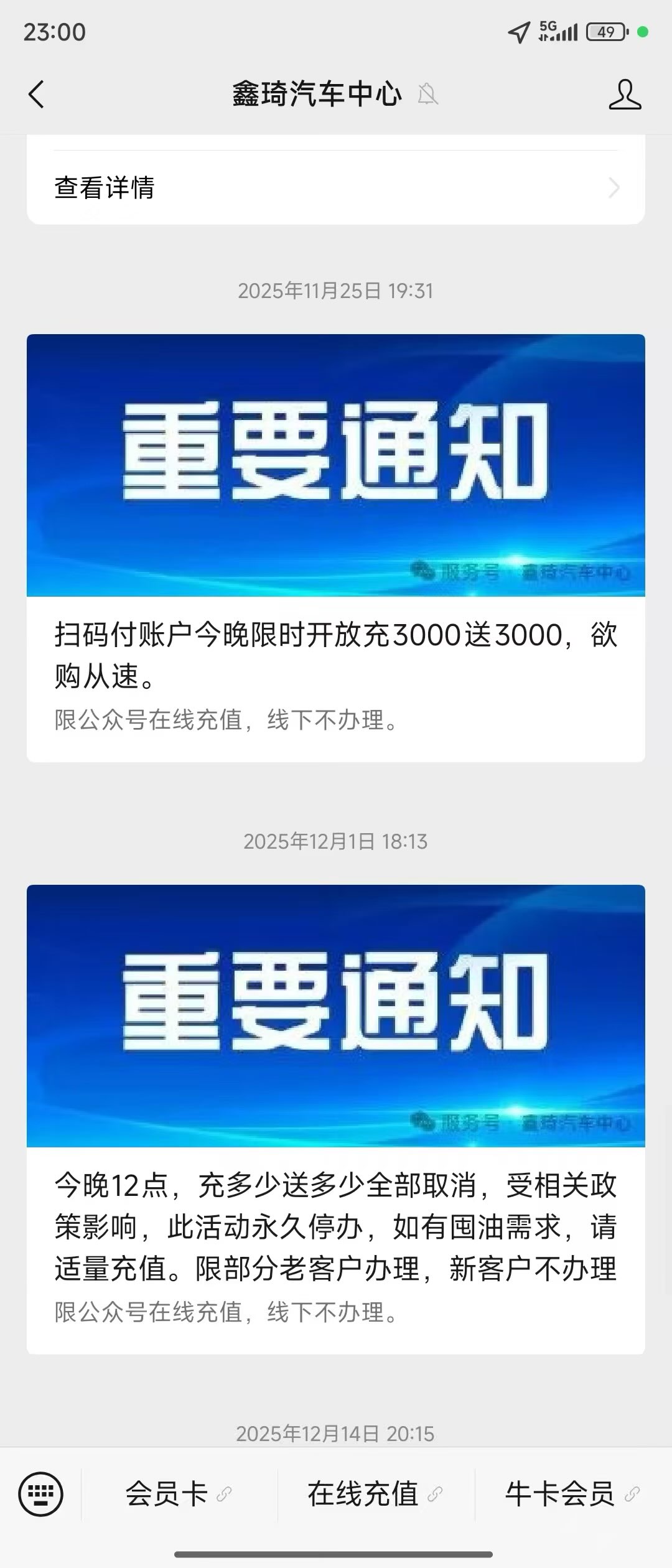 “以前虽然有活动,但是充值的人并不多。去年‘双11’‘双12’的时候,加油站说最后一次搞活动,以后要永久停止了,充的人才变多。”孟女士说,从2025年11月开始,加油站不断推送促销活动通知,通知中出现“限时开放”“今晚12点,充多少送多少全部取消,受相关政策影响,此活动永久停办”等话术,吸引消费者大额充值。